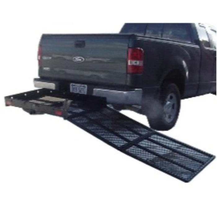 The ramp is 33.25" wide by 64.50" long, giving you a gentle slope to easily roll your scooter or wheelchair onto the carrier. It folds into three positions: flat for storage, upright for travel, and unfolded for loading. A simple pull-pin system locks the ramp into place quickly and securely.