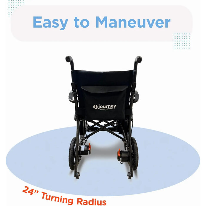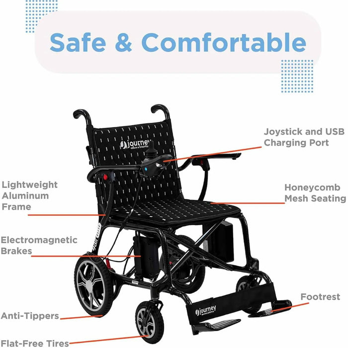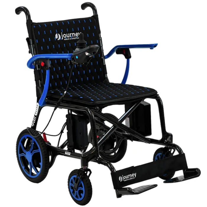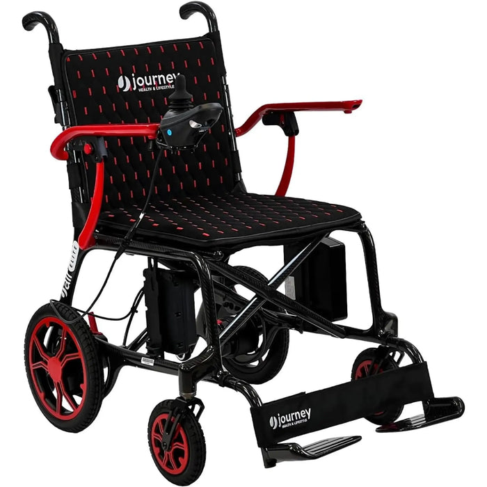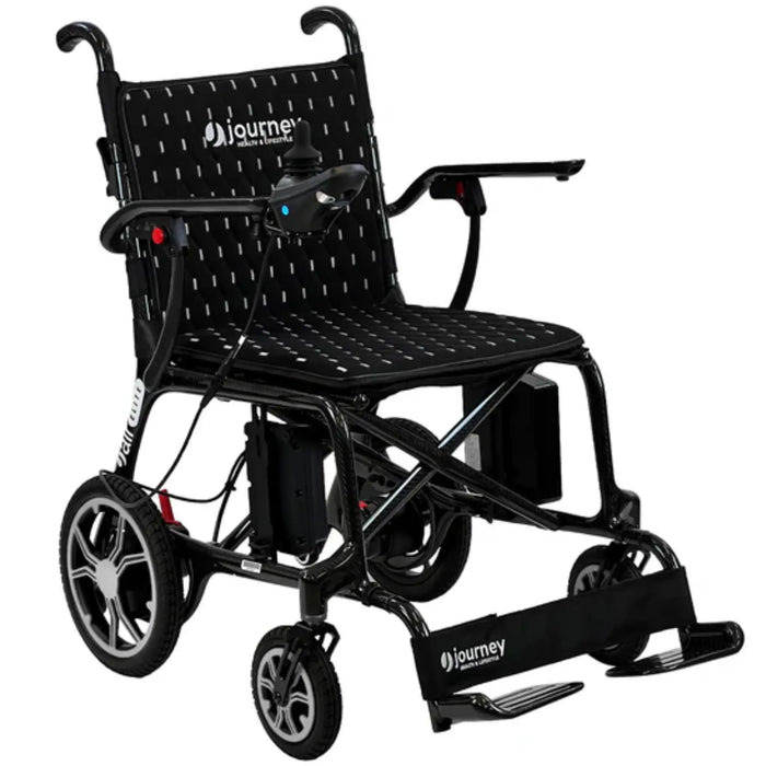 The Journey Air Elite Folding Power Chair is built for everyday use at home or while traveling. The carbon-fiber frame weighs about 26 pounds without the battery and folds flat with one motion for storage or transport. Quiet dual motors and single-hand joystick control provide steady movement on indoor floors and outdoor paths. The compact frame folds securely, allowing the chair to be stored or transported without disassembly.