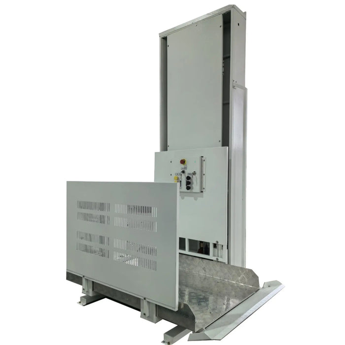 The P-Lift Series arrives partially assembled, with all major mechanical components pre-built. Installation is straightforward: position and level the base frame, mount the main tower, slide on the carriage, attach the toe plate and handrail, and complete the final adjustments.